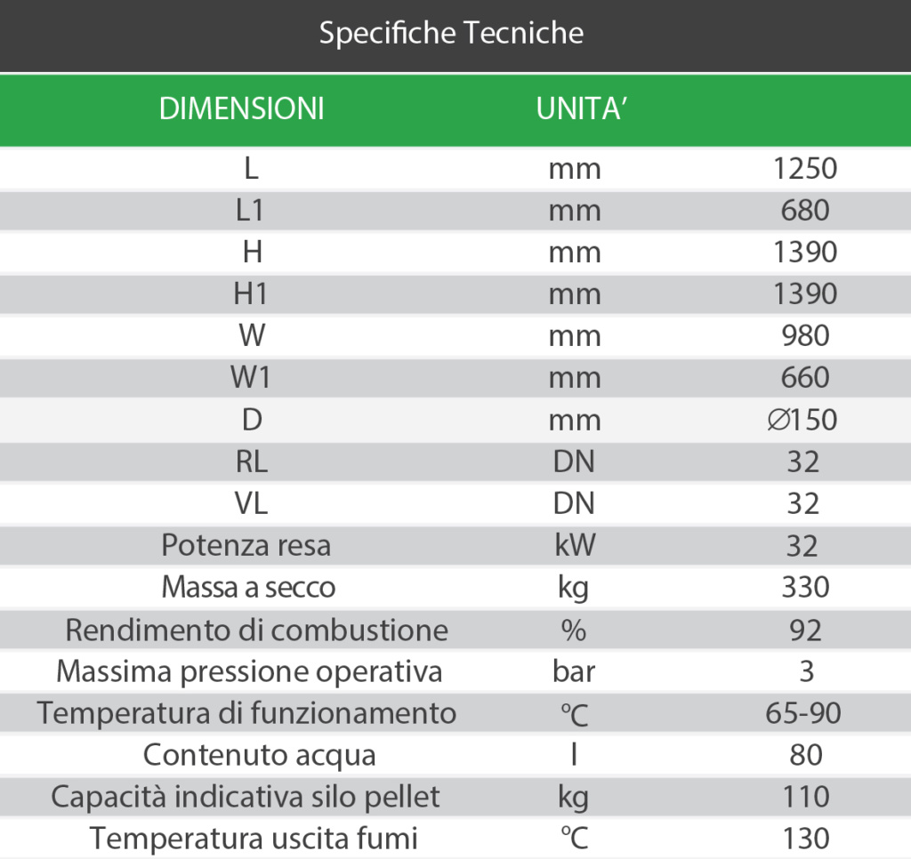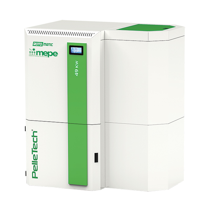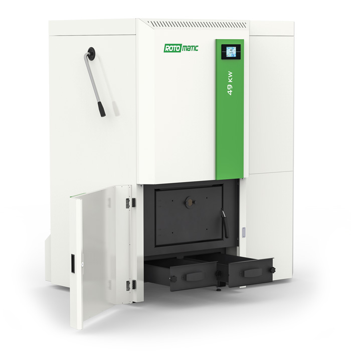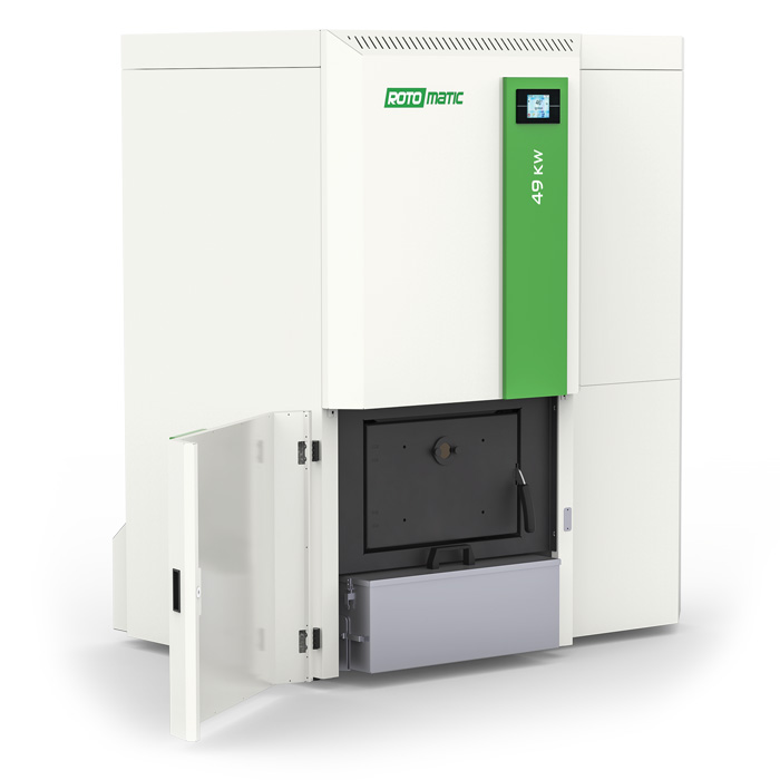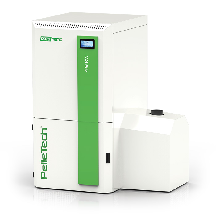 Caldaie a pellet di legnaNuovo sistema generatore di calore con silo per il pellet incorporato, bruciatore in ghisa e nuovo ed innovativo sistema di pulizia. L’alta efficienza e la temperatura di uscita fumi molto bassa garantiscono alla caldaia di avere bassi consumi e di essere eco compatibile presentando emissioni bassissime. Le caldaie Rotomatic sono caratterizzate da un nuovo ed innovativo bruciatore. Lega resistente alle alte temperature, portata del combustibile controllata e sistema di pulizia automatico garantiscono lunga durata dei componenti, altissima efficienza di combustione continuativa nel tempo e grandi risparmi economici. Versioni disponibili: Standard per alimentazione e silo esterni alla caldaia, Silo con silo incorporato e Pneu con sistema di aspirazione pneumatico incorporato. Potenza 32 kW.