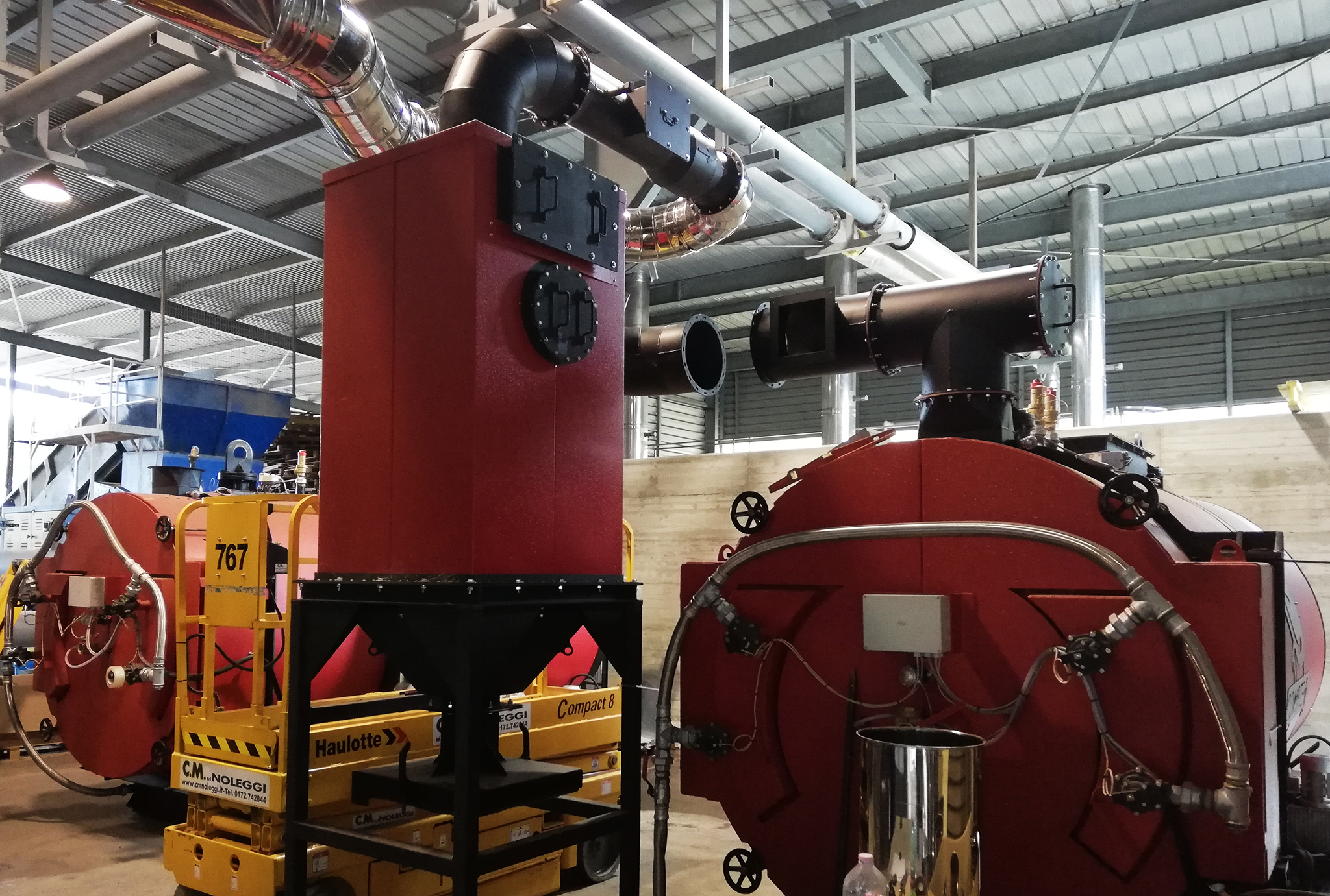 Impianto a cippato da 2000 kW per la rete di teleriscaldamento di un’area industriale. Rete che è a servizio di uffici e magazzini costituita da due caldaie da 1000 kW. Il sistema è alimentato tramite coclee da silo in muratura con sistema di estrazione a rastrelli mobili a servizio di un impianto complessivo di 5 caldaie.